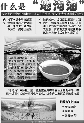 研究表明,長期攝入地溝油會對人體造成明顯傷害,如發(fā)育障礙、易患腸炎,并有肝、心和腎腫大以及脂肪肝等病變。而地溝油中的主要危害物之一黃曲霉素是一種強(qiáng)烈的致癌物質(zhì),其毒性是砒霜的100倍。另一個問題是倫理上的,別人吃過的油,在下水道里變質(zhì),再撈上來,你能吃得下去嗎? 那么,有沒有一種簡便的方法,可以鑒別地溝油呢?我們不妨聽聽食品科學(xué)專家和業(yè)內(nèi)人士怎么說。 1、科學(xué)鑒別地溝油 目前沒有好辦法 在一個注重食品安全的時代,理想的狀態(tài)是,你下館子,隨手掏出一張試紙浸到菜里,過一會兒拿出來跟譜表比比,然后大叫:“掌柜的,換油!” 2、傳統(tǒng)的檢測方法 都有一定局限性 在科研工作者看來,治理地溝油的難點在于,經(jīng)過洗滌、蒸餾、脫色、脫臭等精煉過程后,單從外觀和感官上,很難區(qū)分地溝油和普通油。不法商販還會把地溝油摻入食用油中,如果含量較少,更是難以檢測。 3、鑒別地溝油 冰箱顯身手? 曾在北京多家大酒樓擔(dān)任總廚、高管的特級廚師馮鵬說,一般情況下,地溝油和普通油無法區(qū)分,進(jìn)貨時難免上當(dāng)。他只能通過實踐來判斷:飯館炒菜之前一般要先過油,在這道“滑油”工序中,好油可反復(fù)使用七八次,而地溝油最多使用三次就會變黏,而且有哈喇味兒。 “另外,室外溫度較低時,地溝油會像棕櫚油一樣凝固,所以常有人用地溝油冒充棕櫚油。”馮鵬說,冬天可以據(jù)此鑒別地溝油,夏天則可通過冰箱來檢驗。一些媒體認(rèn)為地溝油有味道,可以聞出來,此外里面含水多,下鍋會爆響,馮鵬認(rèn)為這些都是無稽之談,因為水根本摻不進(jìn)油中,且地溝油也沒什么異味。 4、我們該如何 鑒別地溝油? 一看。看透明度,純凈的植物油呈透明狀,在生產(chǎn)過程中由于混入了堿脂、蠟質(zhì)、雜質(zhì)等物,透明度會下降;看色澤,純凈的油為無色,在生產(chǎn)過程中由于油料中的色素溶于油中,油才會帶色;看沉淀物,其主要成分是雜質(zhì)。 二聞。每種油都有各自獨特的氣味。可以在手掌上滴一兩滴油,雙手合攏摩擦,發(fā)熱時仔細(xì)聞其氣味。有異味的油,說明質(zhì)量有問題,有臭味的很可能就是地溝油;若有礦物油的氣味更不能買。 三嘗。用筷子取一滴油,仔細(xì)品嘗其味道。口感帶酸味的油是不合格產(chǎn)品,有焦苦味的油已發(fā)生酸敗,有異味的油可能是地溝油。 四聽。取油層底部的油一兩滴,涂在易燃的紙片上,點燃并聽其響聲。燃燒正常無響聲的是合格產(chǎn)品;燃燒不正常且發(fā)出“吱吱”聲音的,水分超標(biāo),是不合格產(chǎn)品;燃燒時發(fā)出“噼啪”爆炸聲,表明油的含水量嚴(yán)重超標(biāo),而且有可能是摻假產(chǎn)品,絕對不能購買。 五問。問商家的進(jìn)貨渠道,必要時索要進(jìn)貨發(fā)票或查看當(dāng)?shù)厥称沸l(wèi)生監(jiān)督部門抽樣檢測報告。 |